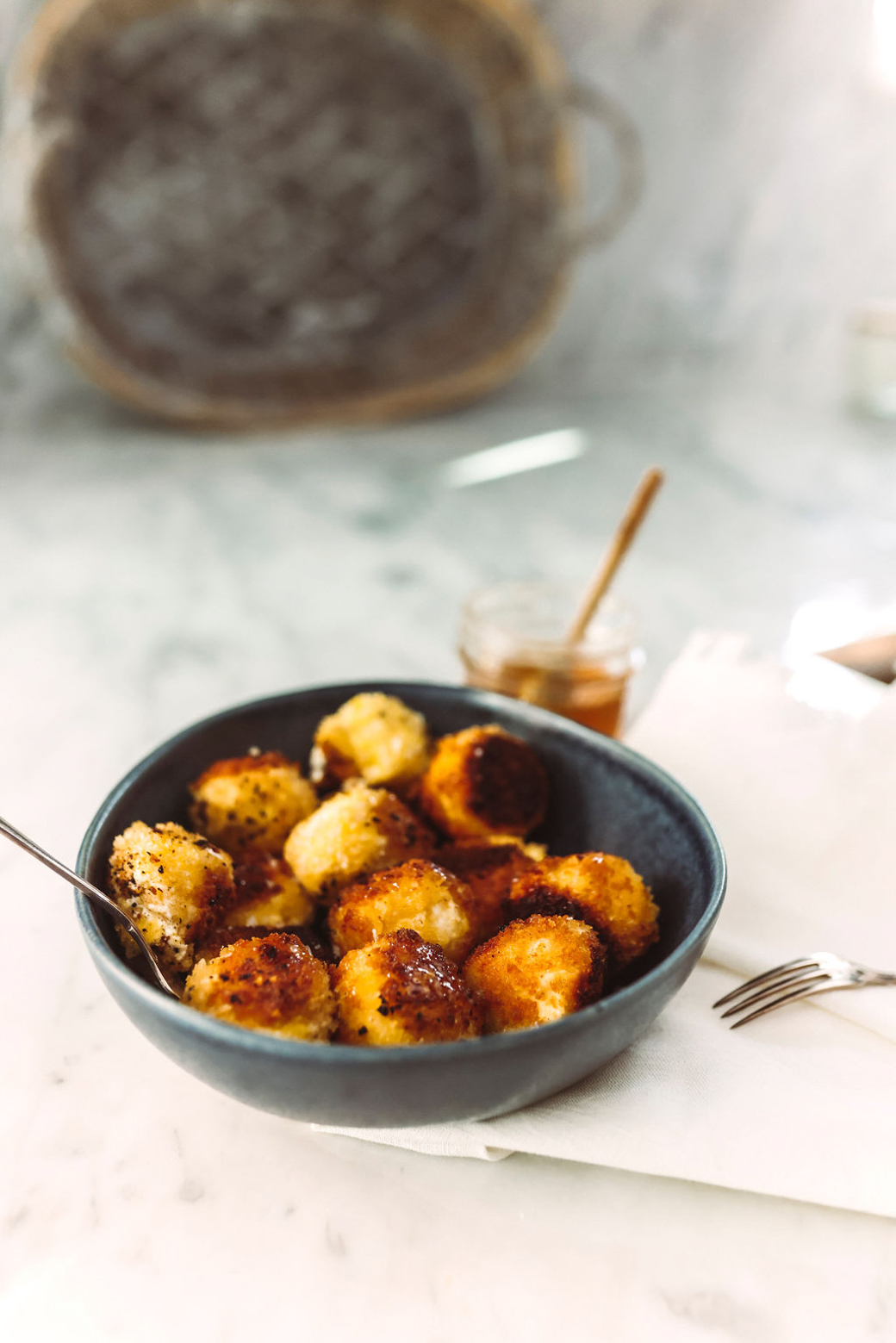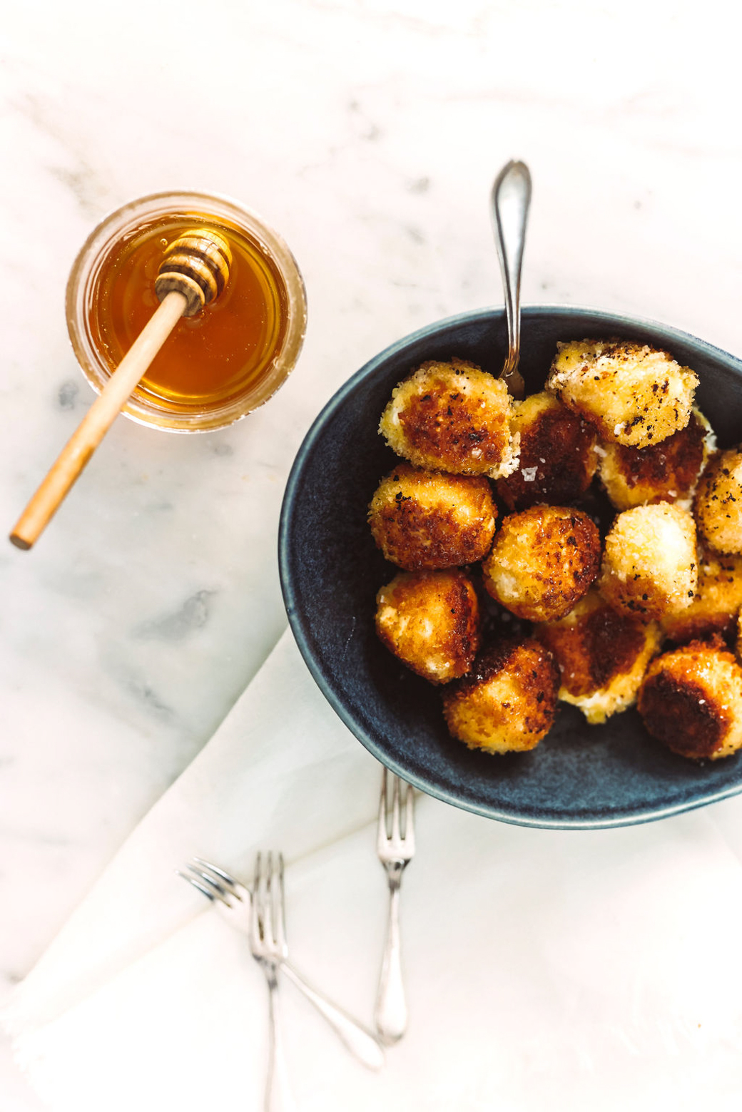 However, there is no written rule saying that your Super Bowl menu has to be laden with cheese and chips. Chili on the stovetop with all the fixings, a large green salad and a few drool worthy apps sounds just as good to me! So when I came across this recipe for fried Goat Cheese Balls, I thought how perfect would this be for Super Bowl Sunday! I mean it does check off two of our favorite food categories for game day-fried and cheese! But with a little more panache. They are creamy, crunchy and tangy. Add that drizzle of honey and oh my goodness, talk about elevating the taste! These little puffs of joy are so simple to make and guaranteed to be an instant crowd pleaser!
