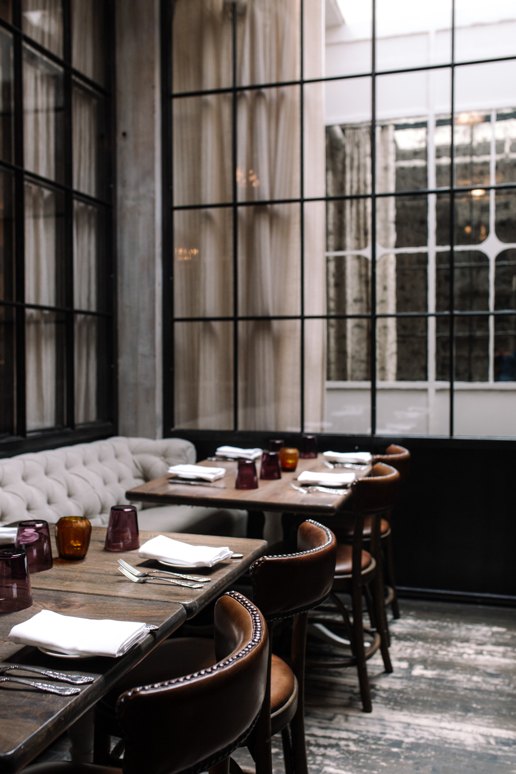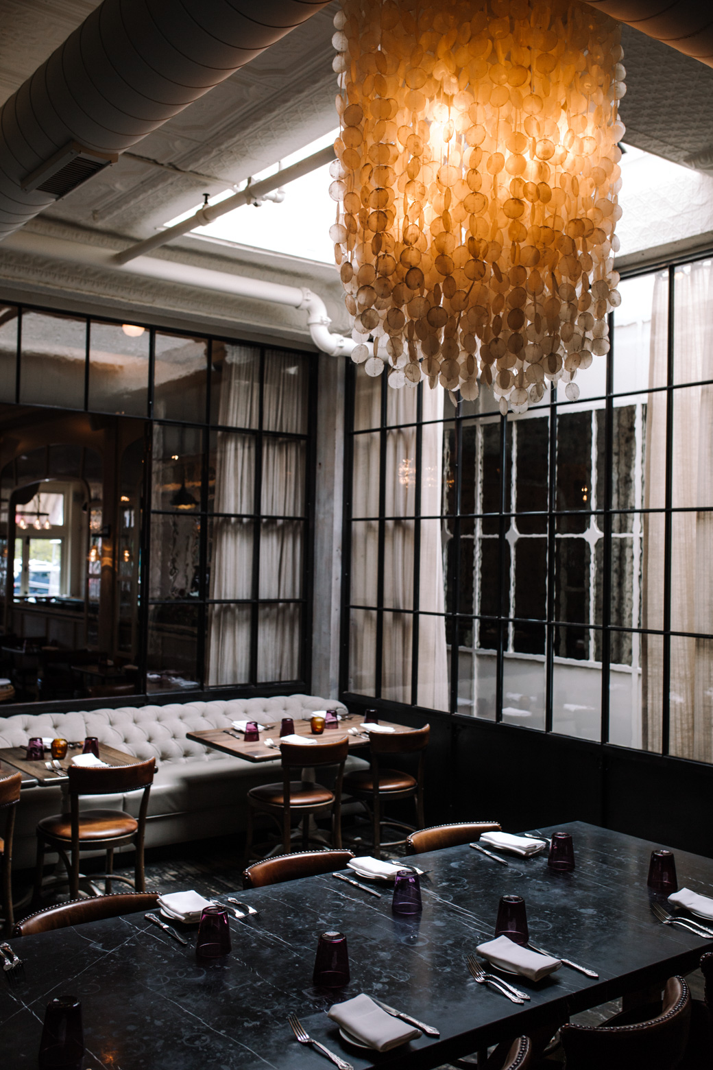 A beautiful combination of textures and hues defines this space. Distressed wood, leaded glass window panes and leather cafe style seating are coupled with feminine grey, green, and violet tones. The feeling is a perfect mixture of moody and bright. The richer ambiance towards the front of the restaurant is offset by large street-side windows that bring in plenty of natural light. The back boasts white painted brick walls, hightop tables and an open kitchen featuring white subway tiles. And situated right in between these two areas is perhaps my favorite space in Guildhall- a room enclosed in leaded glass with the most dreamy chandelier taking center stage and a skylight filtering in a warm glow.