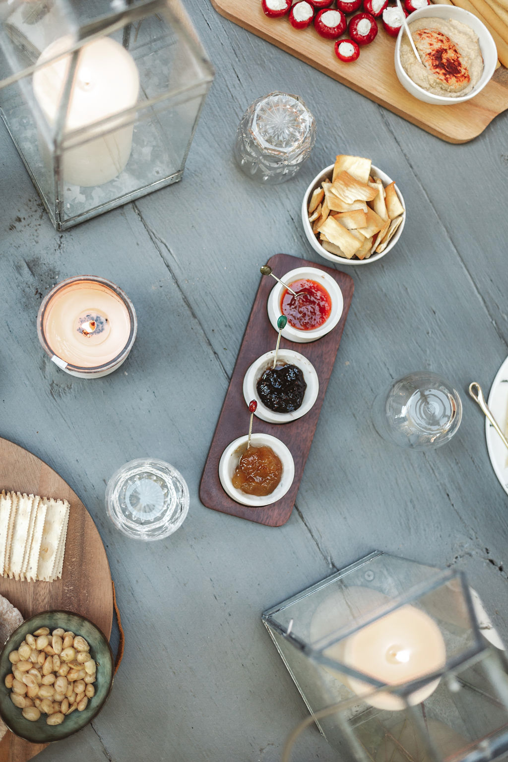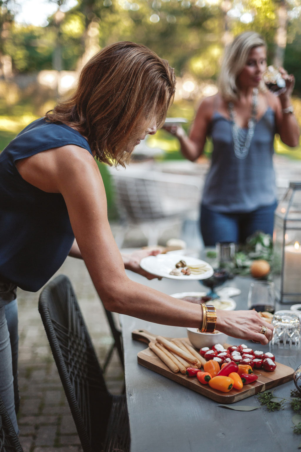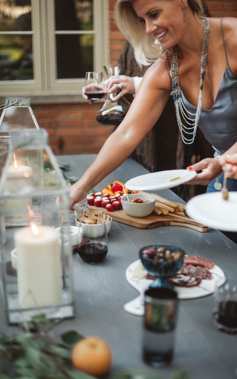 If your evening takes place outdoors, lighting candles and building a fire set the perfect mood for when the sun goes down. I also love filling an outdoor basket with blankets and wraps that my guests can grab if they get chilly.