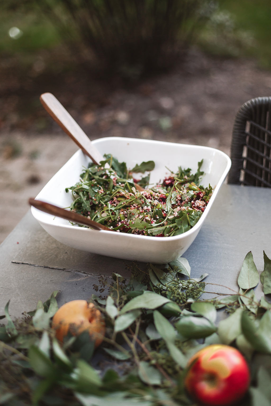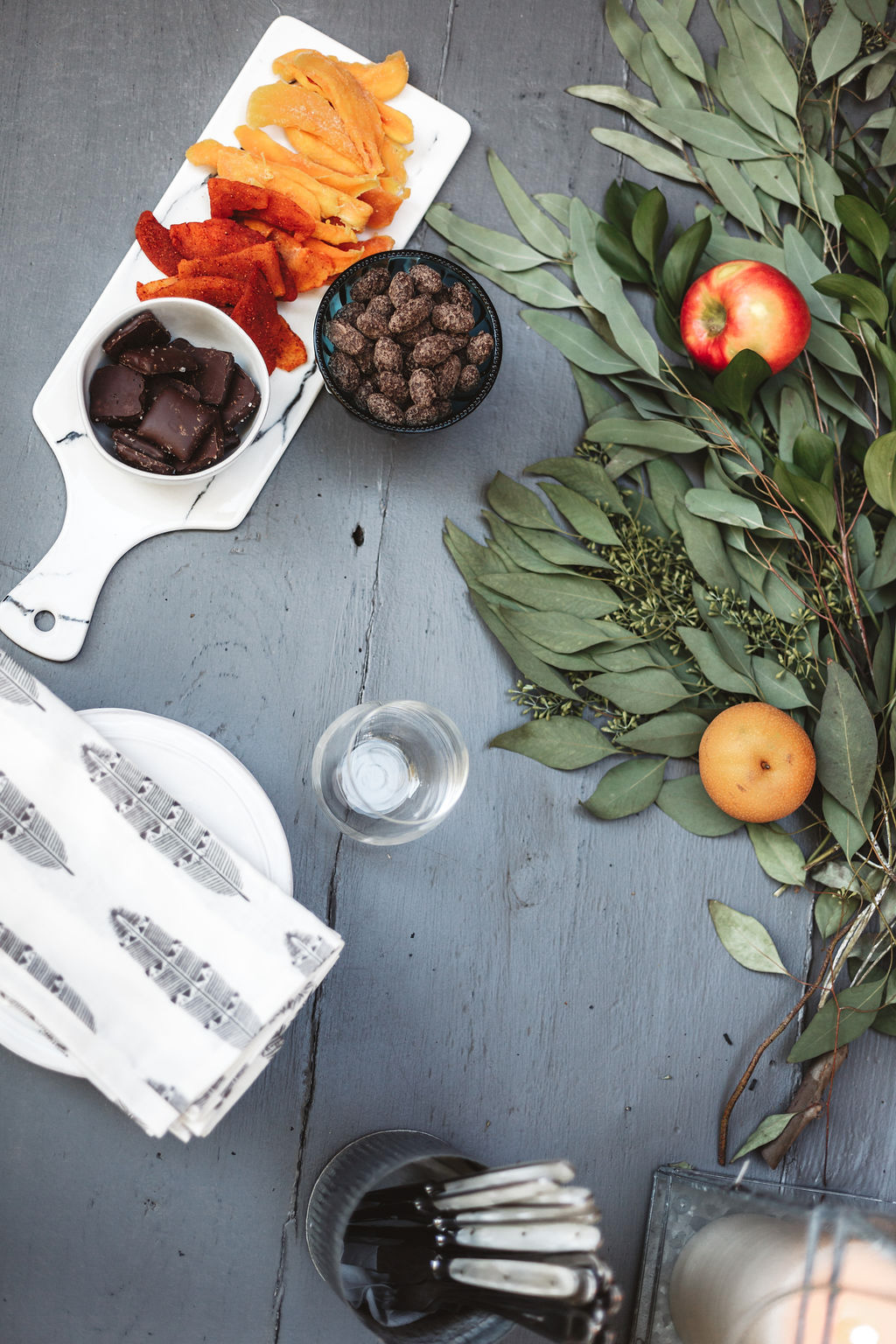 Colorful food and florals indicative of the season are the perfect way to dress up your neutral serving wear and add ambiance to your table. For this time of year, I love peppers, dried fruit and a salad filled with grains and root vegetables. Perhaps my favorite part of putting my table together is creating a floralscape. Greens are my favorite with added pops of color. For autumn, I love using seeded eucalyptus leaves and fruit.