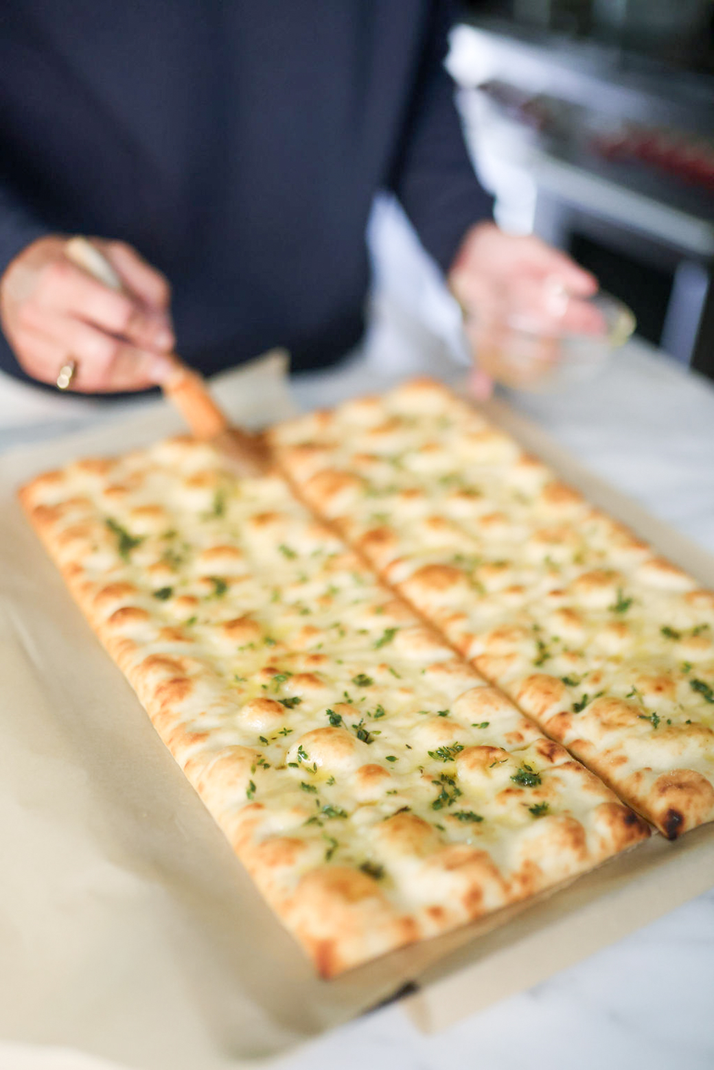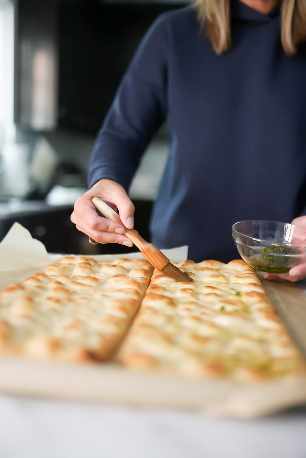 As mentioned the easiest thing to do is grab your pre-made flatbreads from Trader Joe’s. But I personally think you need to add one little step here. Because the crust is already cooked, I like to spread an herbed olive oil on before I add my toppings. That way, when you pop it in the oven again, it will not dry out before the toppings are cooked through.