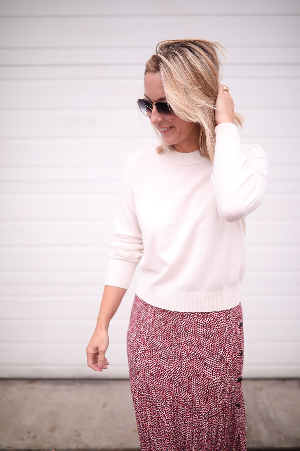 Sweater here // Skirt similar here // Sunglasses here // Sneakers here