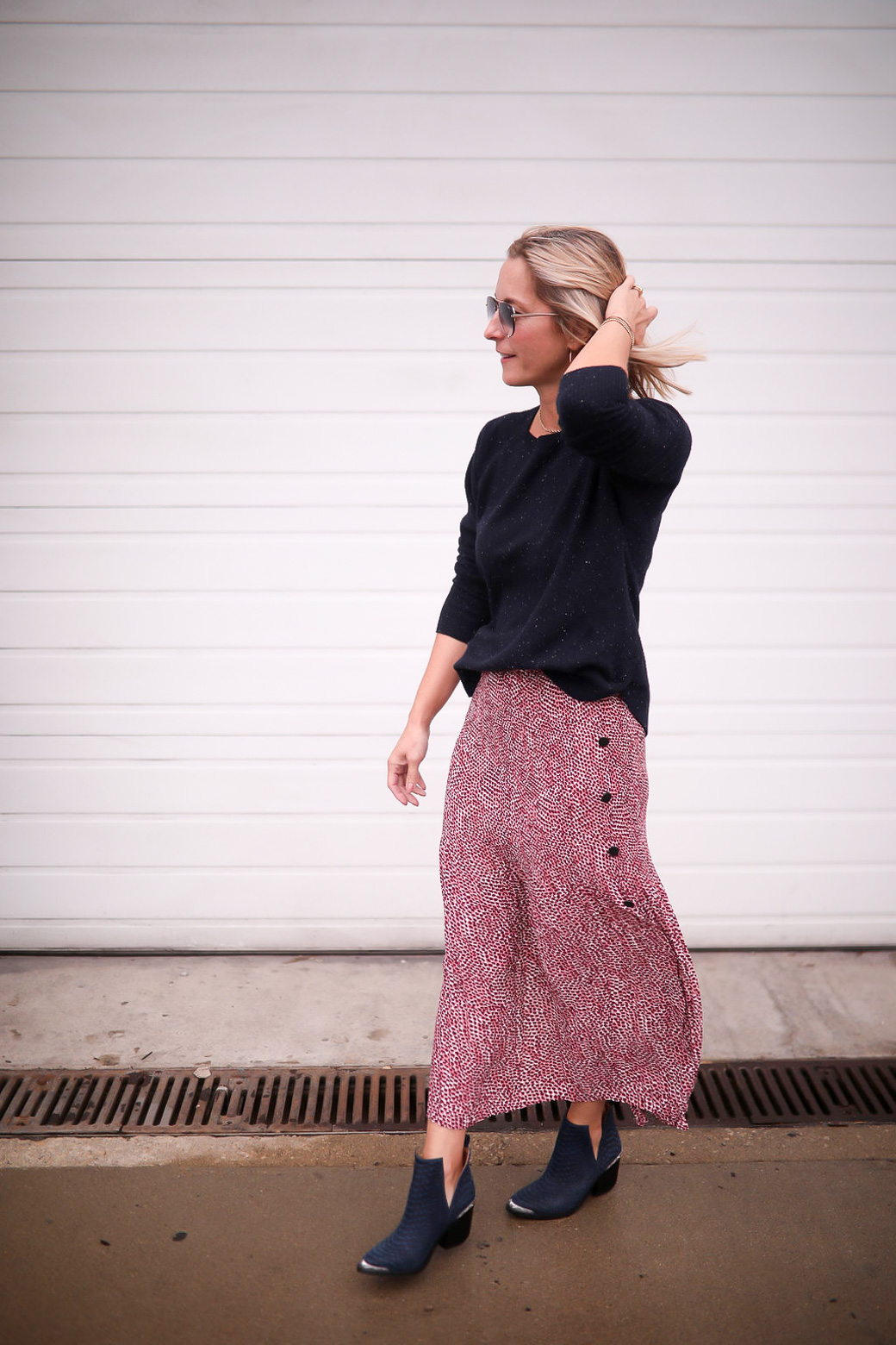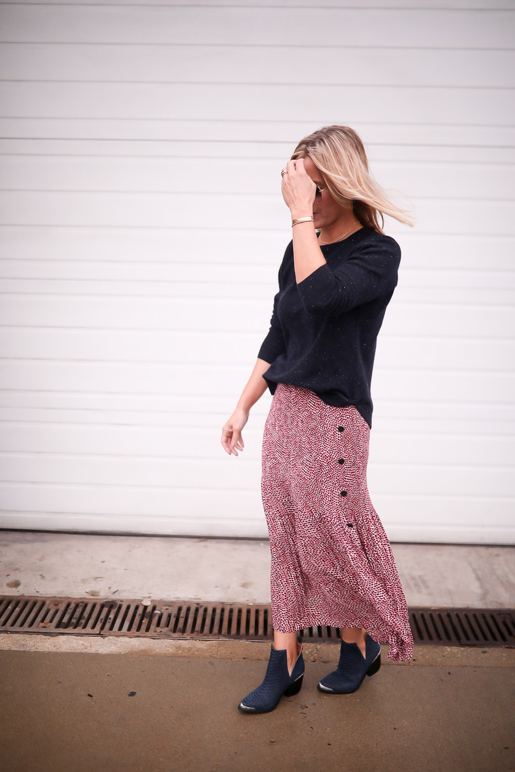 A short boot looks great with a midi skirt. And I love utilizing my cowboy boots anytime I can outside of Nashville! On top here, I paired a slouchier sweater with my skirt. I fell it works because it it still tailored at the neck and shoulders. Tucking it in to the waist helps pull the look together a bit better!