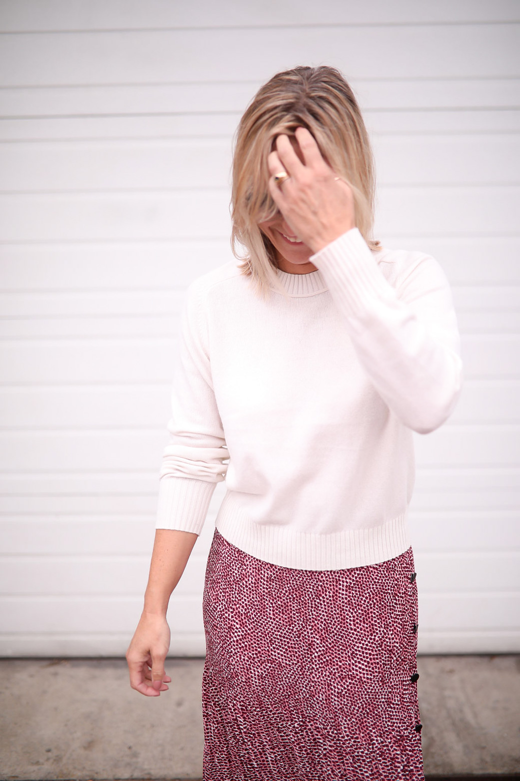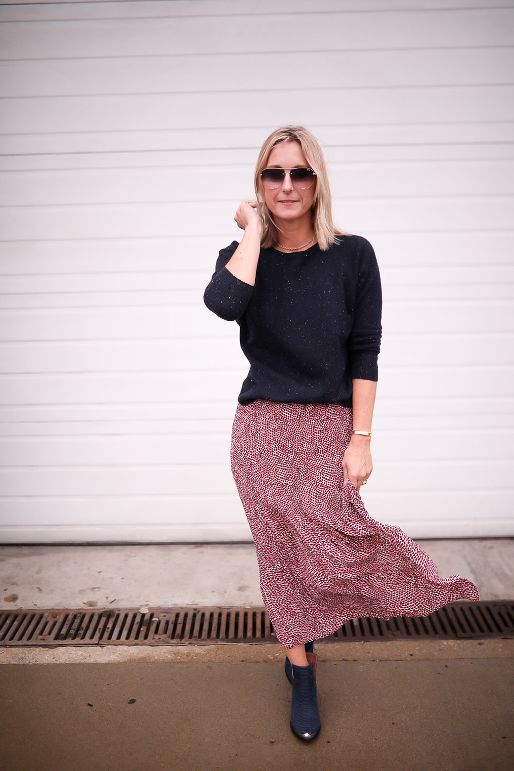 When it comes to styling a long skirt, balancing the pieces you wear is important so that your look does not come off as sloppy. If the skirt is long and flowy, then generally a more fitted or structured top and edgy shoe works best. If the skirt is fitted and at the knee, then a looser top and streamlined shoes brings the right balance to your look. Or if the skirt is floral printed or heavily patterned, keep it to a basic on top. I also tend not to layer or accessorize too much when wearing a long skirt (well, let’s be honest, I rarely accessorize!).