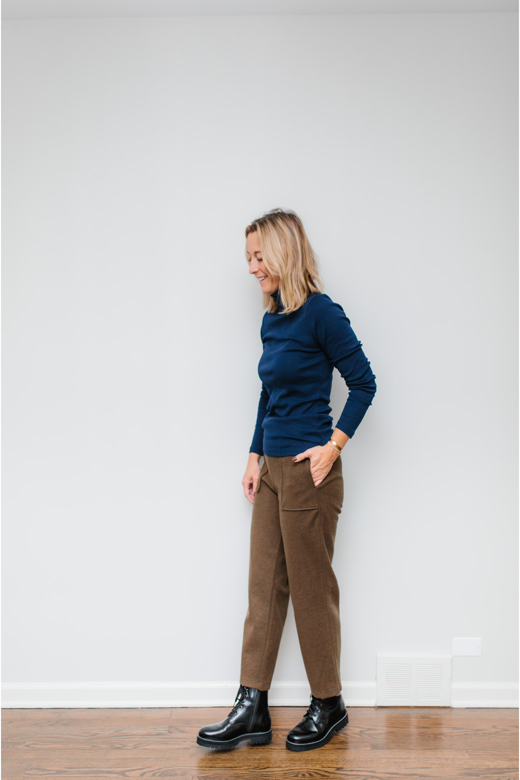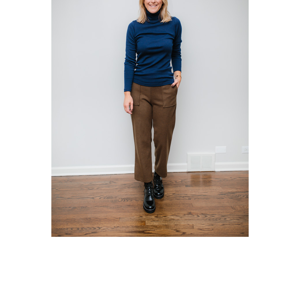 I wanted to show that combat boots can be worn with other bottoms besides denim but combat boots with skirts or dresses personally does not work for me! I love the idea of combat boots styled with a wide leg crop pant though! These wool (not itchy) pair are a great dressier alternative to wear this winter. And once again, I am in my favorite winter basic, the perfect turtleneck from J. Crew!