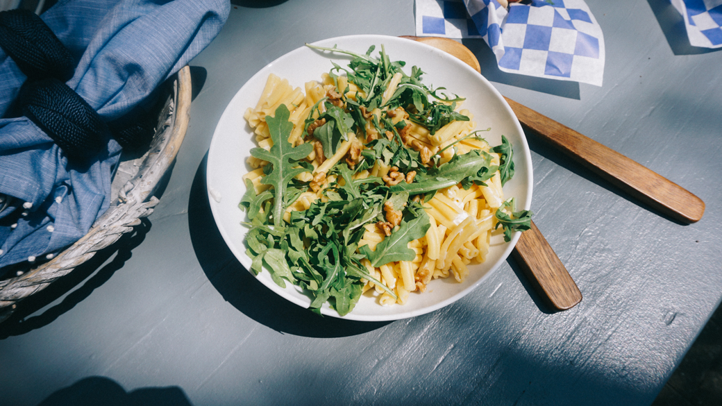 Gemelli Pasta with Goat Cheese, Arugula and Pine Nuts