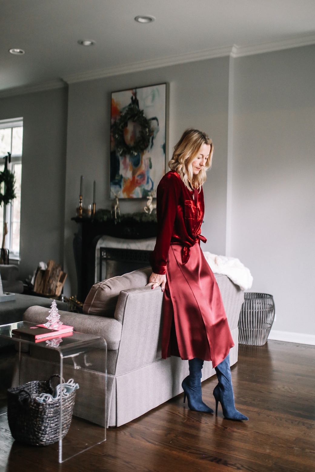 Since velvet is a visually heavy fabric, pair it with more delicate fabrics for balance. I was able to find a red silk skirt that worked perfectly with this top. Silk is a softer yet still luxe fabric that works nicely with velvet and I love bringing these two fabrics together.
